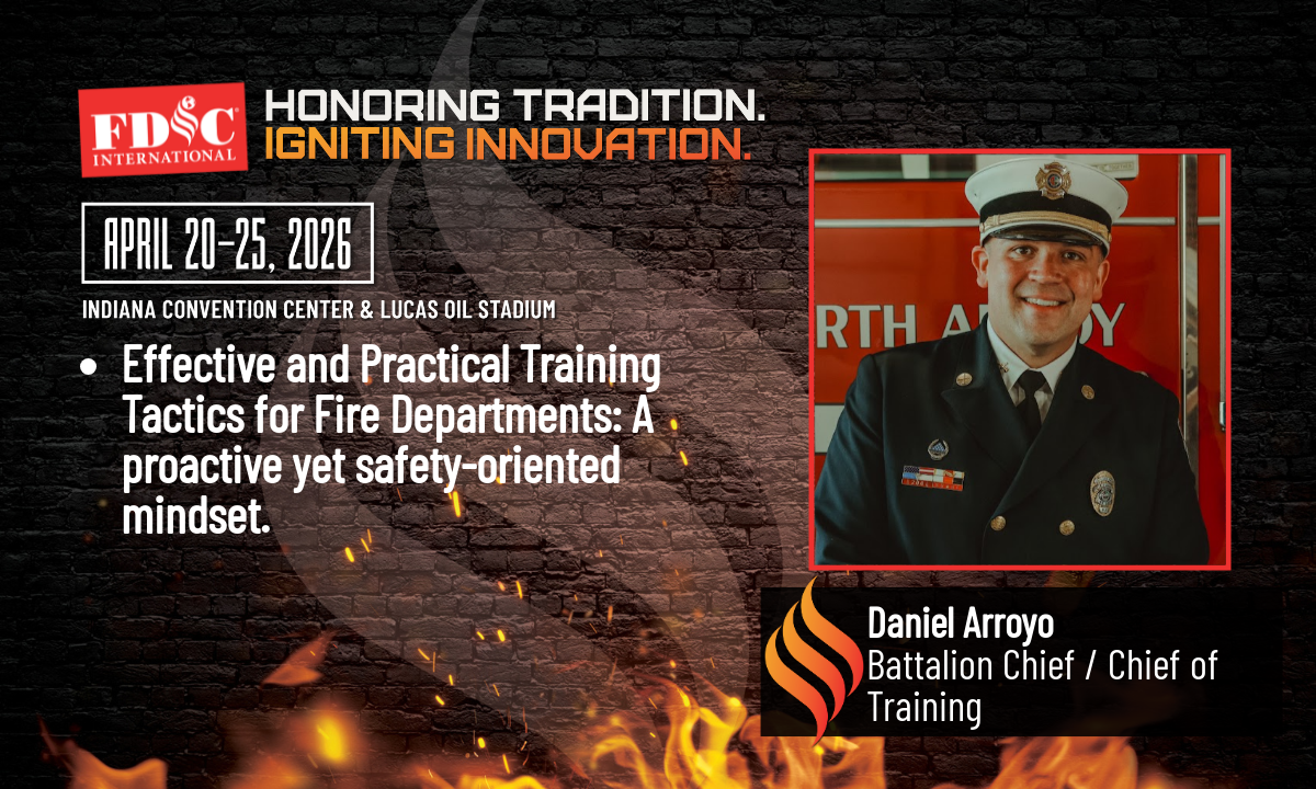 We are proud to announce that our owner and Chief of Training Danny Arroyo will be presenting at FDIC 2026! He will be teaching his “Effective & Practical Training Tactics for Fire Departments: A Proactive Yet Safety-Oreinted Mindset” class. He will be given a hour and 45 min presentation time during the week of April 20, 2026. This training class is designed to instill a practical mindset in fire department personnel, emphasizing the importance of proactive and effective training strategies while prioritizing safety. Participants will explore a comprehensive framework for establishing and executing training programs that enhance operational readiness and team performance through knowledge sharing and comprehension. Students will learn how to establish, run, adjust, and conduct training within their departments while adhering to NFPA guidelines and OSHA safety standards.
